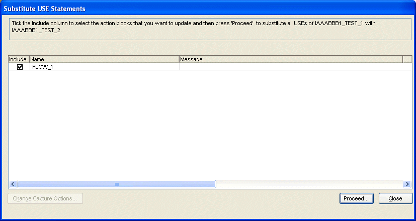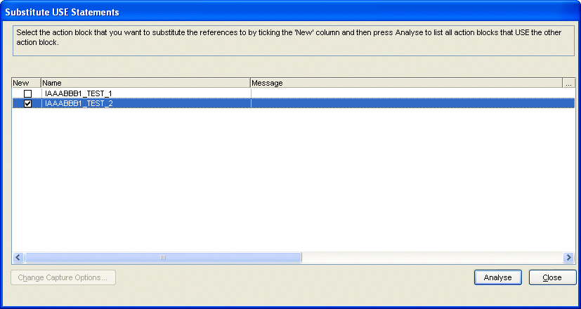 Next press the Analyse button to list all action blocks that USE the old action block. The list will then display all action blocks that USE this action block. If you do not want to substitute the USE statements in one or more of these, then un-tick the Include column checkbox.