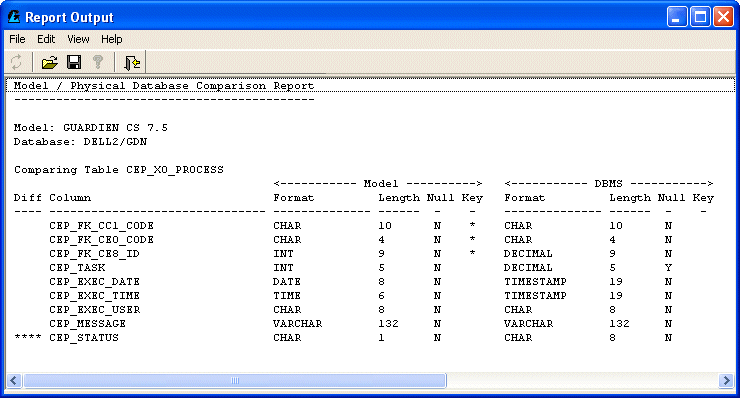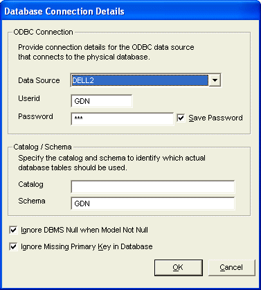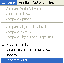 You can compare the model with many different physical databases, for example, development, test & production. The database connection details are specified using the Connection Details dialog.Once the database connection details have been provided, you can see any differences between the model and the physical database: