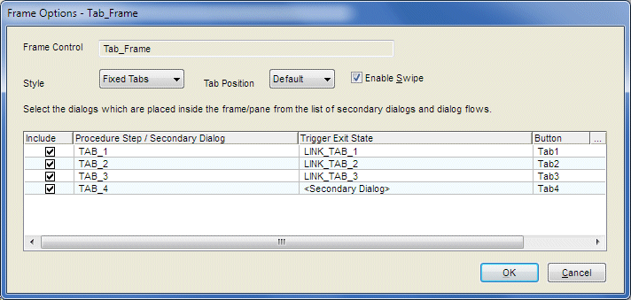 Using the Rapide Designer, you can specify which windows are loaded into the frame container. These can be windows from separate procedure steps or secondary dialog boxes from the same procedure step. |