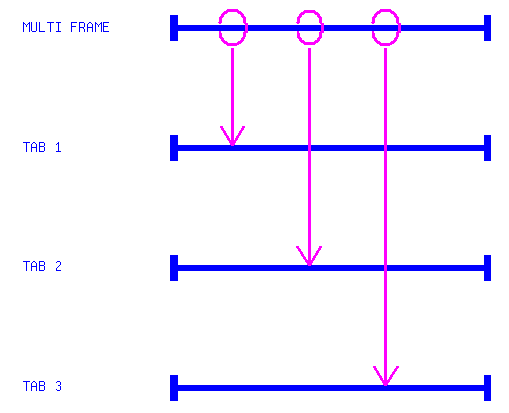 In this example, the main window MULTI_FRAME has dialog flows to three separate child windows (Tab1-3) and also has a secondary dialog box (Tab4). |