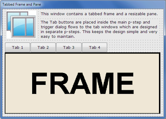 Rapide Frames allow the UI designer to embed windows and dialog boxes from a secondary dialog in the same procedure step or the primary dialog from another procedure step within a 'frame' or 'pane'. A pane divides a window or dialog box into two parts with a resizable divider, either horizontal or vertical.