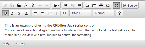 | This example shows the use of a rich text JavaScript control to allow the user to control the formatting of a text field. The data entered into the control is bound to a Gen text attribute with the formatting defined using html tags. |