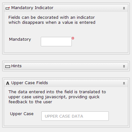 Group Boxes can be defined as collapsible and have an optional image bitmap. In the example on the right, there are three collapsible group boxes with the middle one contracted. You can see how these work in the on-line Rapide Controls Demo. |