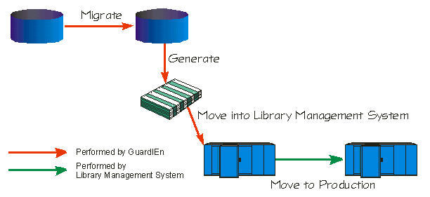 GuardIEn can also work with existing configuration management tools like Endevor, Harvest, ChangeMan and Dimensions so that these can be retained to perform the final stages in a production implementation. The figure below illustrates the integration of Gen and a library management product using GuardIEn to provide the interface.