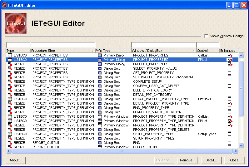 IETeGUI Editor is Gen toolset plug-in that will automatically create the NOTE statements in the model that are required to enhance the GUI. The Editor is launched from the Gen toolset Plug-in menu. The initial window displays a list of windows and dialog boxes in the toolset model that can be resized and the list boxes that can be enhanced. |