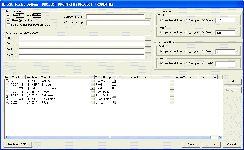 This is accomplished by specifying which controls are tracked when the window is resized. The IETeGUI Editor resize option dialog below shows the specification for the window displayed above: