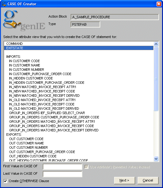 With genIE, we can select the CASE OF creator function, then choose EXITSTATE.genIE then allows us to choose exit states from a list, or since we have already selected the USE statement, it also provides options for selecting exit states from either the action blocks in the subset or from all used action blocks in the encyclopaedia. In the example below, it has found 3 possible exit states.