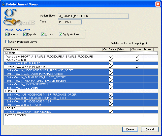 Deleting unused views with genIE is simple - the views that can be deleted are calculated by genIE. To delete them, highlight the views to be deleted and press the Delete button.
