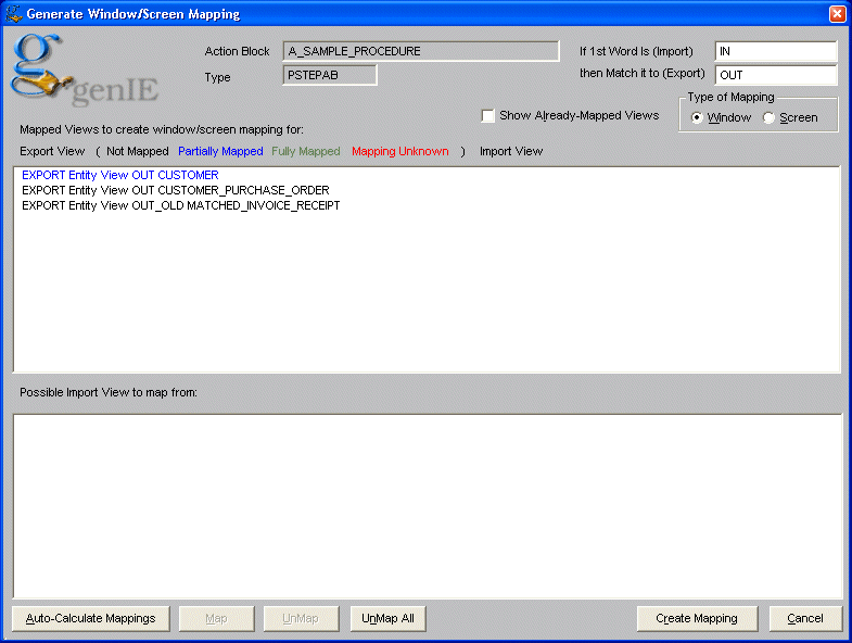 The Auto-Calculate Mappings function determines the most likely import view to map to the export view based on similar names. Alternative import views can be selected if the automatically calculated views are not correct. The Create Mapping button will then update the window / screen mapping.