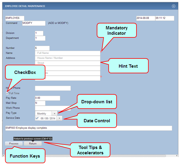 The example below shows some simple enhancements to the Gen sample model screen, using checkboxes, date control, drop-downs, hints and mandatory indicators and function key mapping to enhance the usability of the application in a browser window.