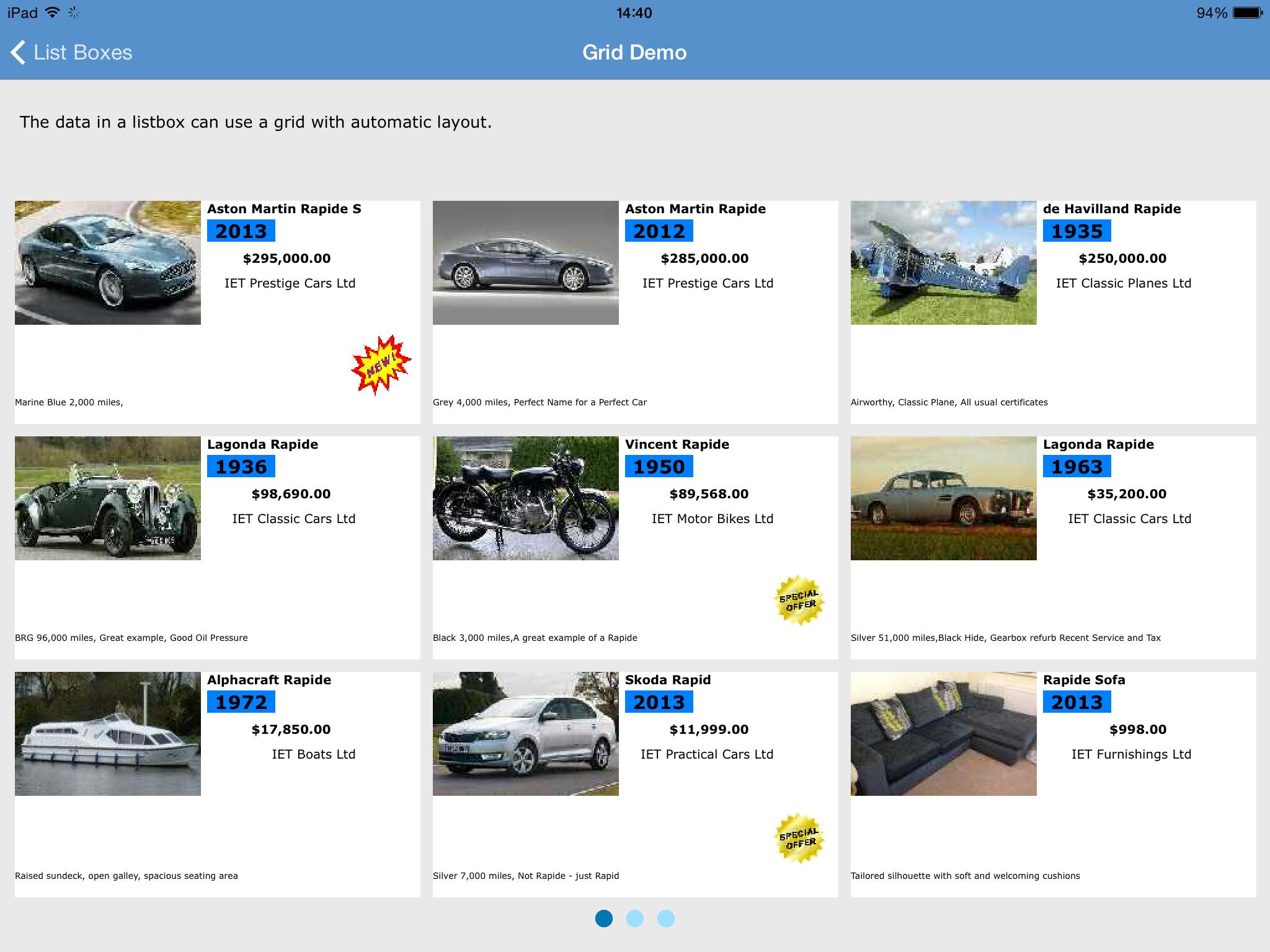 Another feature for Rapide listboxes is the ability to use HTML markup to format the data in a cell. The listbox below is a standard Gen listbox which has been enhanced with Rapide. The data in the Model column contains HTML code that displays the picture and text with formatting markup which is then rendered. The data in the Retailer column is a simple HTML link which will open the link in a separate tab of the browser when clicked.