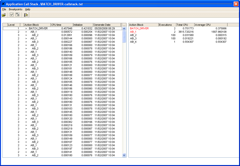 You can save the complete call stack of the application and then view the complete stack and the number of executions of each action block and CPU totals and averages.